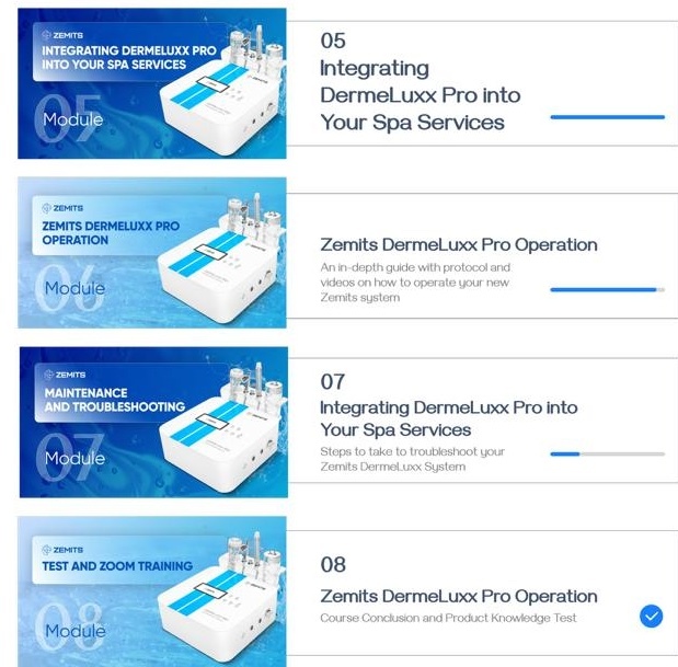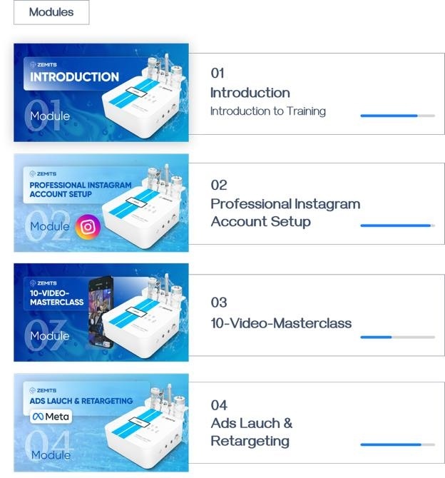 Through 8 well-structured modules, you'll master everything from setting up your professional Instagram account to integrating the Zemits DermeLuxx Pro into your spa services.